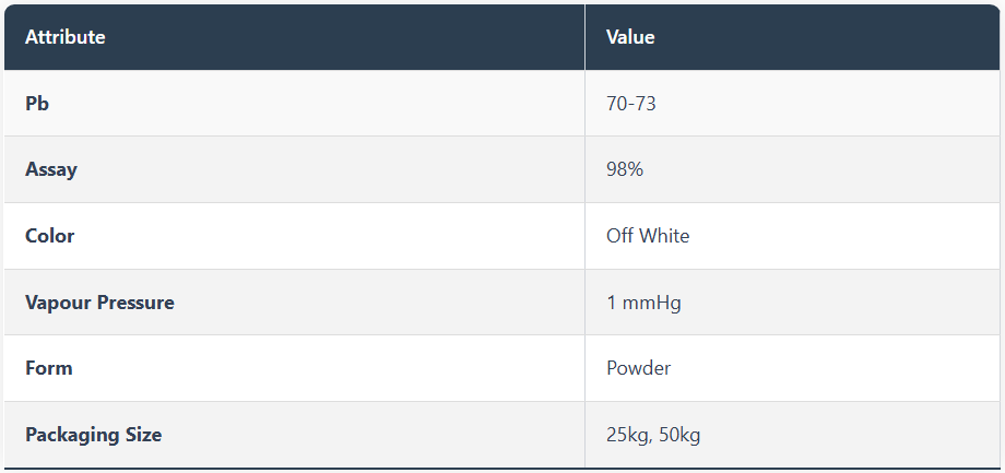 We are into the business of manufacturing, exporting and supplying high quality and pure Lead Chloride. It is an inorganic compound that is considered as one of the most important lead-based reagents. It is available in the form of white to off-white powdered compound and is 98.26% pure. Our lead chloride is formulated using quality-tested constituents in accurate proportion. We offer bulk quantities of lead chloride at nominal price.